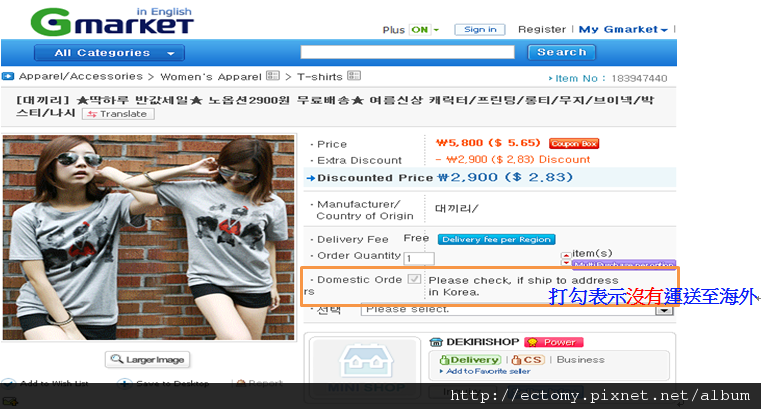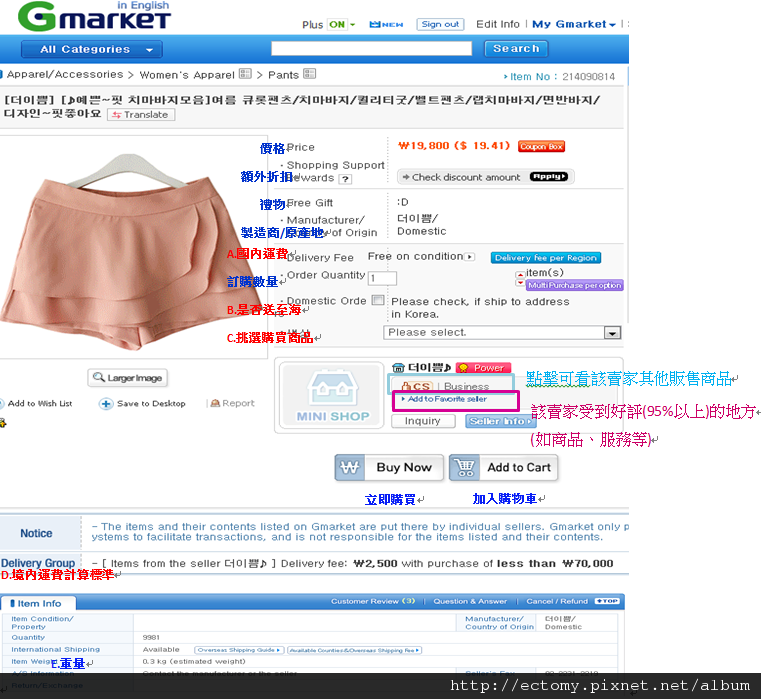 C. 挑選商品:通常韓國賣家一個頁面上會有多樣商品,請先找到喜歡的款式與樣式並記住名稱顏色。